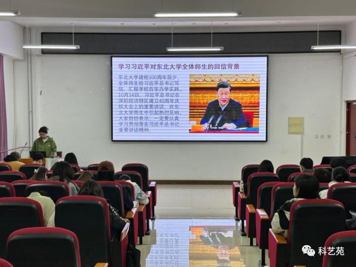 张宣同学给大家分享了习近平总书记给东北大学全体师生回信的主要内容。作为新时代的大学生,我们要毫不动摇地听党话跟党走,努力成长为新时代的“弄潮儿”,写出更多“春天的故事”。