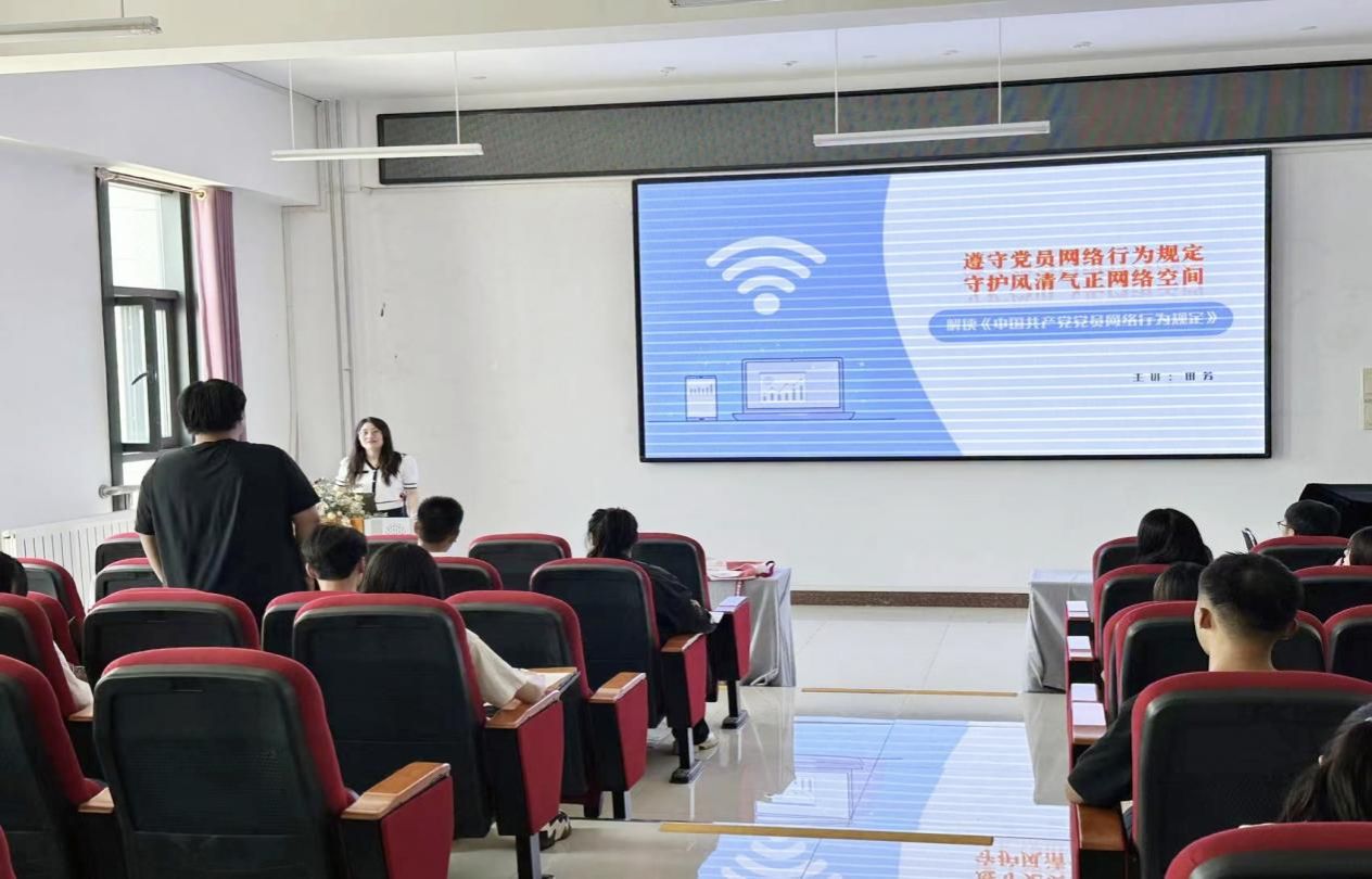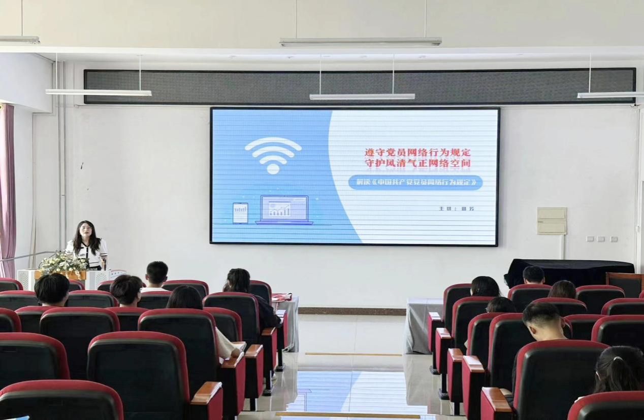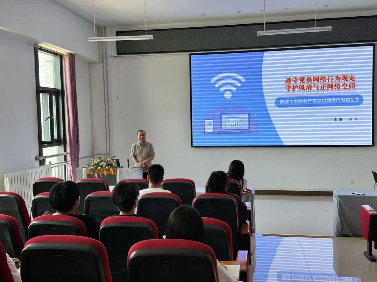 5月28日中午12:30,我院在明德楼B401进行解读《中国共产党党员网络行为规定》党课培训,本次培训主讲人是校党委宣传部副部长田芳,培训由学院党委委员、副院长李志春主持。