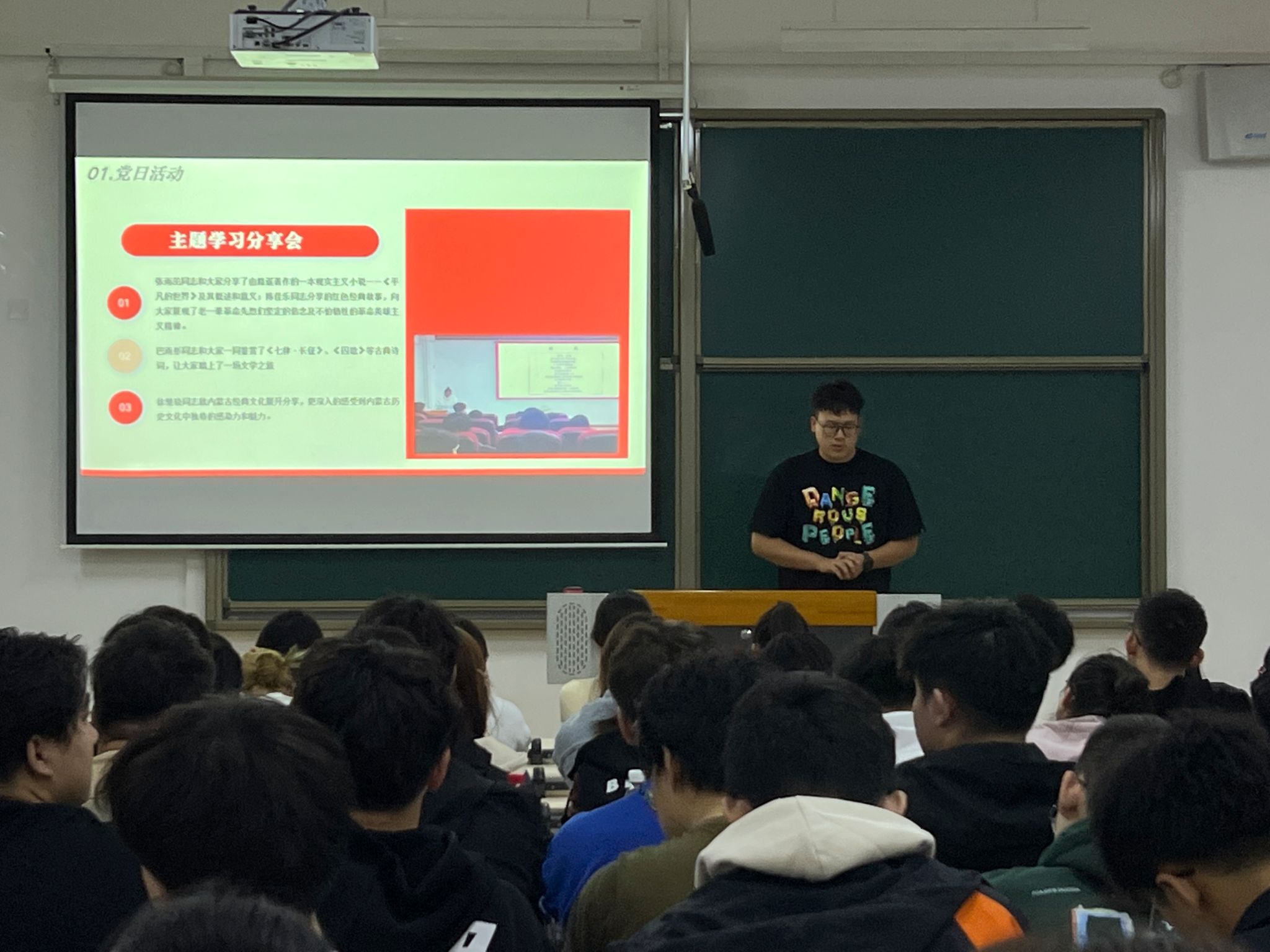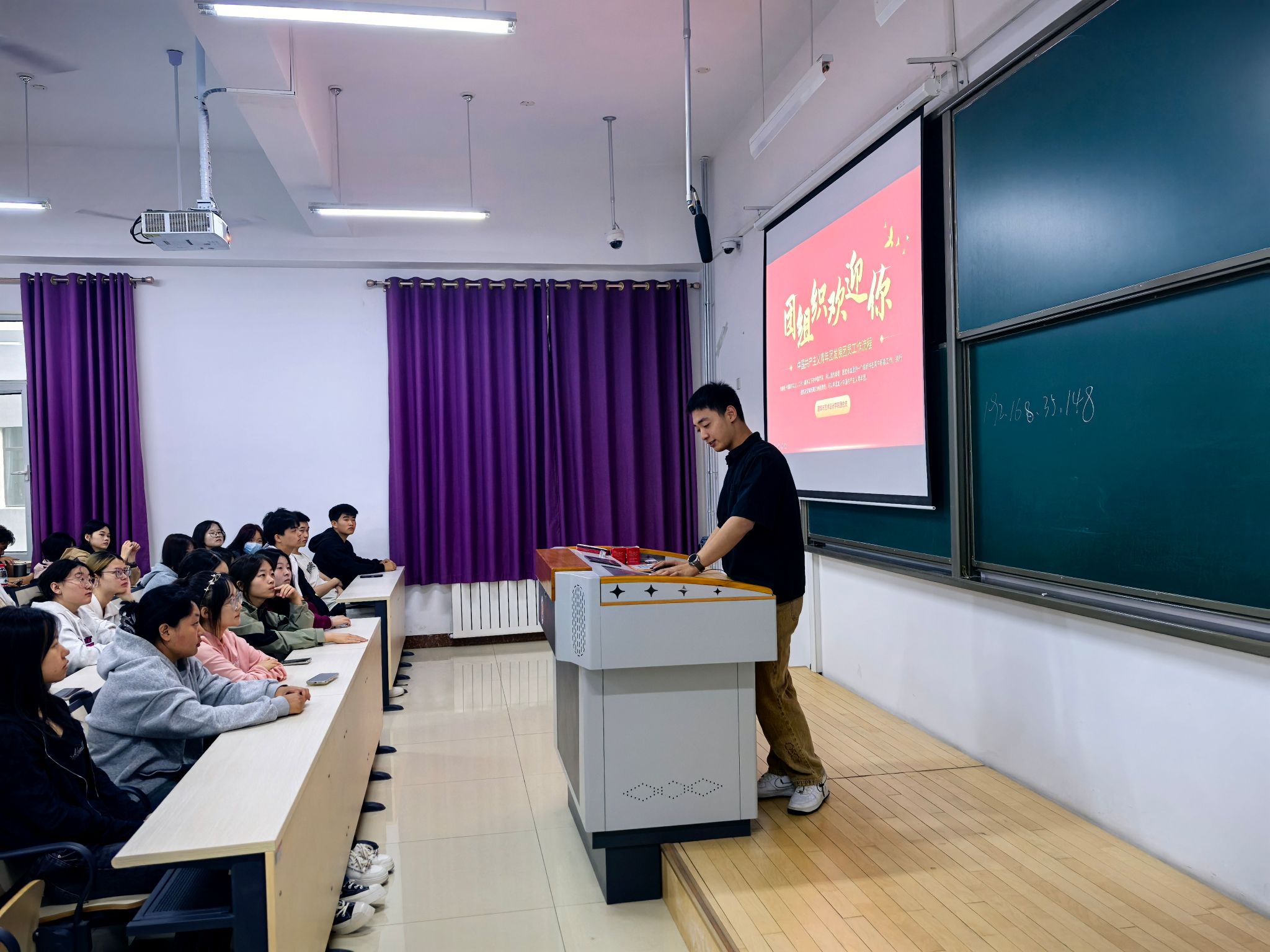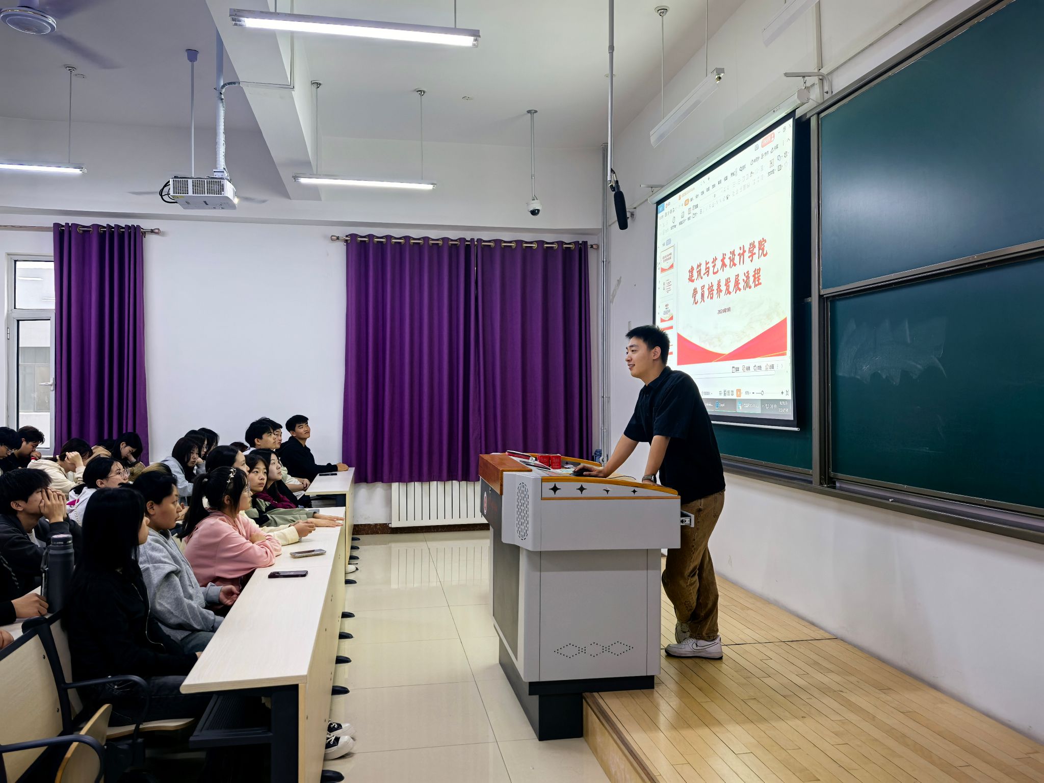 观影结束后,由预备党员代表陈徐讲述各项入团入党的各项事宜。通过预备党员陈徐的分享,新生们了解到了党员培养发展的流程和要求。