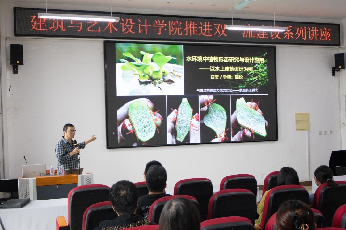 讲座伊始,邱松教授首先回顾了设计的发展历史,指出设计已从解决人造物问题演变为应对人类未来需求与挑战的关键,人类对形态的研究从自然形态、人造形态的研究逐渐向智慧形态研究发展,他强调,形态学研究要综合技术、工程、艺术与设计的多方面知识,并树立系统思维。随后,邱松教授提出设计创新的三条途径,以技术驱动、设计驱动和用户驱动共同实现科技与人文的协同创新,最后,他以精彩的案例展示了形态研究成果如何转化为实际应用,鼓励师生们要勇于探索学科边界,树立交叉学科思维。