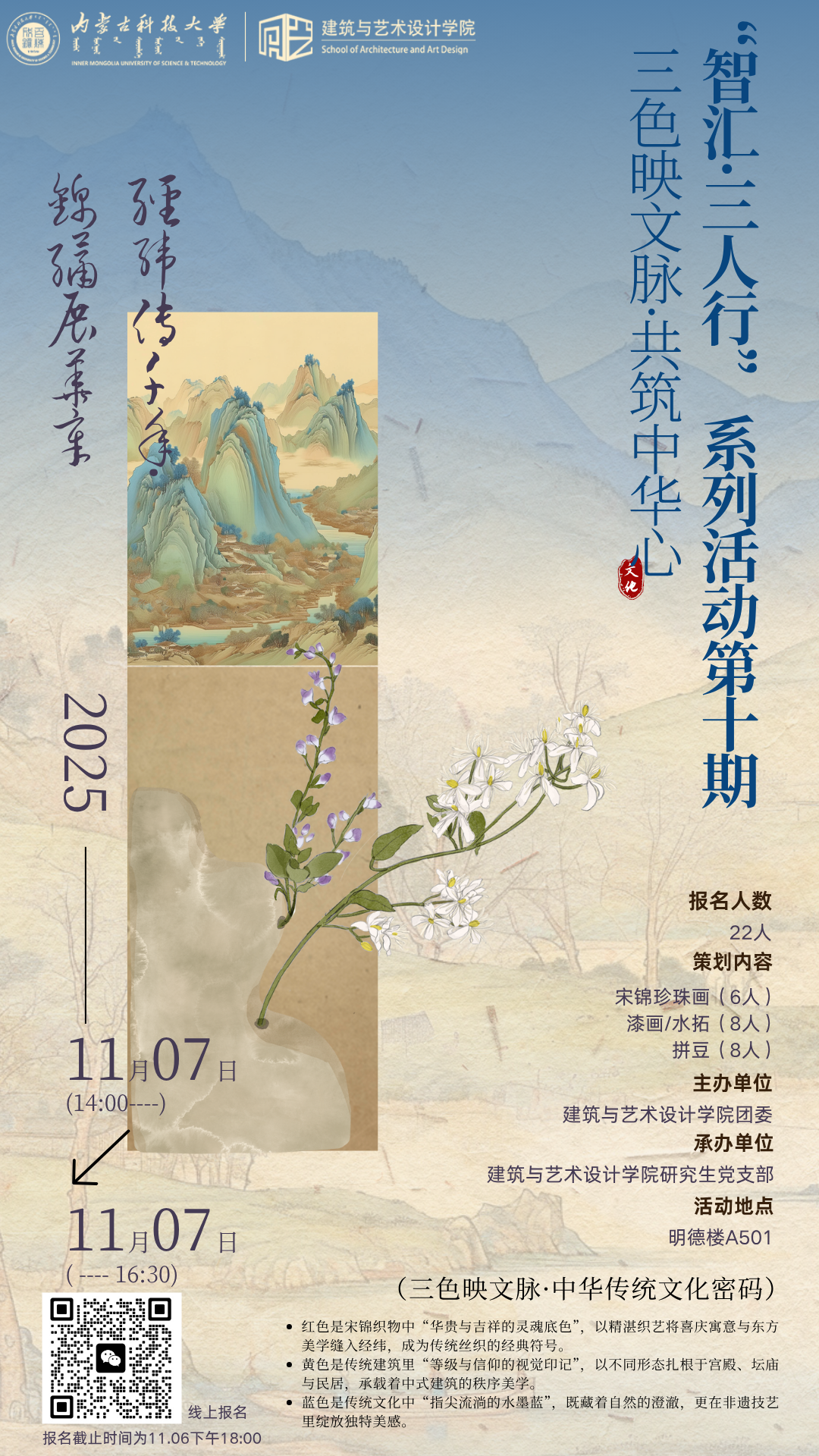 304永利集团“智汇·三人行”系列活动第十期 304永利集团团委与研究生党支部将于11月7日(14:00--16:30)在明德楼A501举办“智汇·三人行”系列活动第十期——“三色映文脉·共筑中华心”,内容涵盖宋锦珍珠画、漆画/水拓及拼豆三类传统文化体验,线上报名截止时间为11月6日18:00,欢迎同学们积极参与。