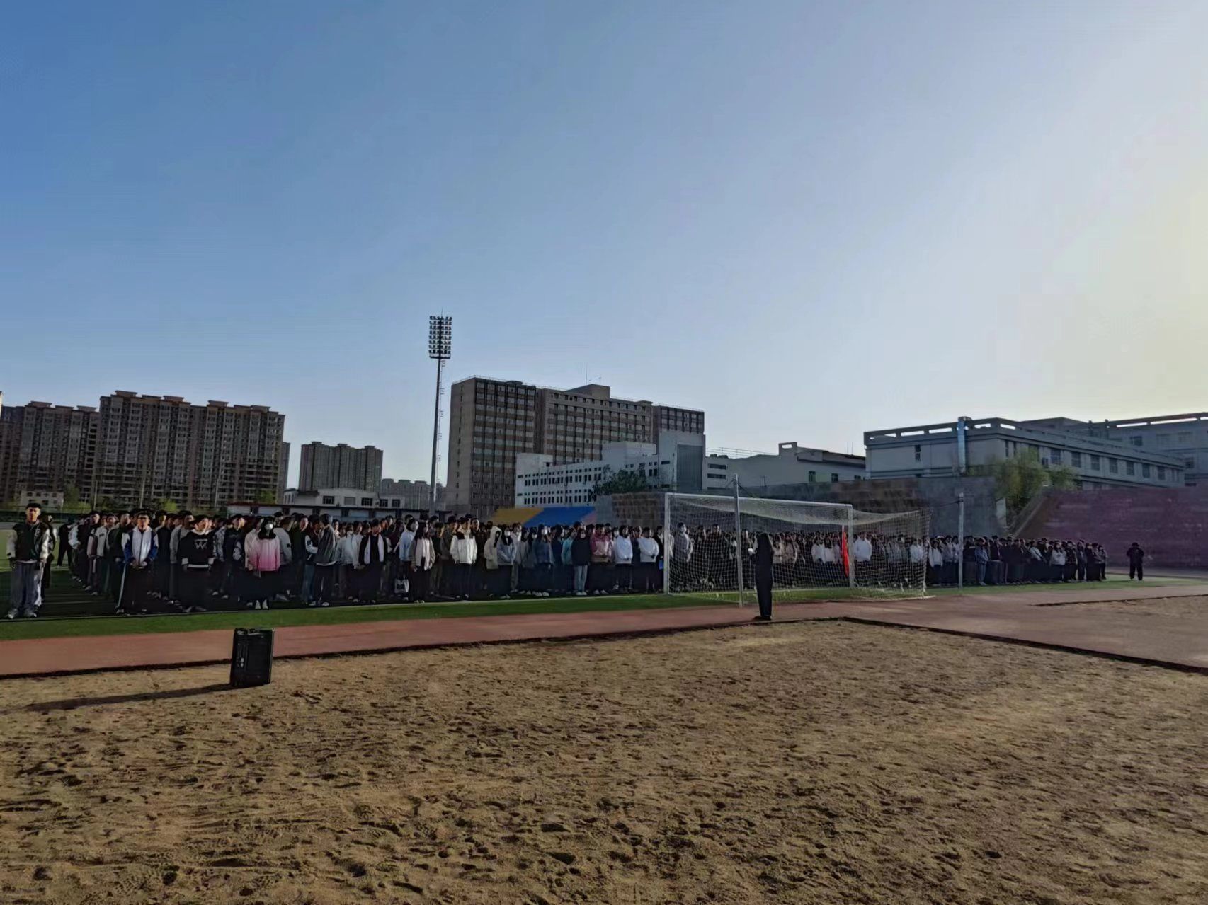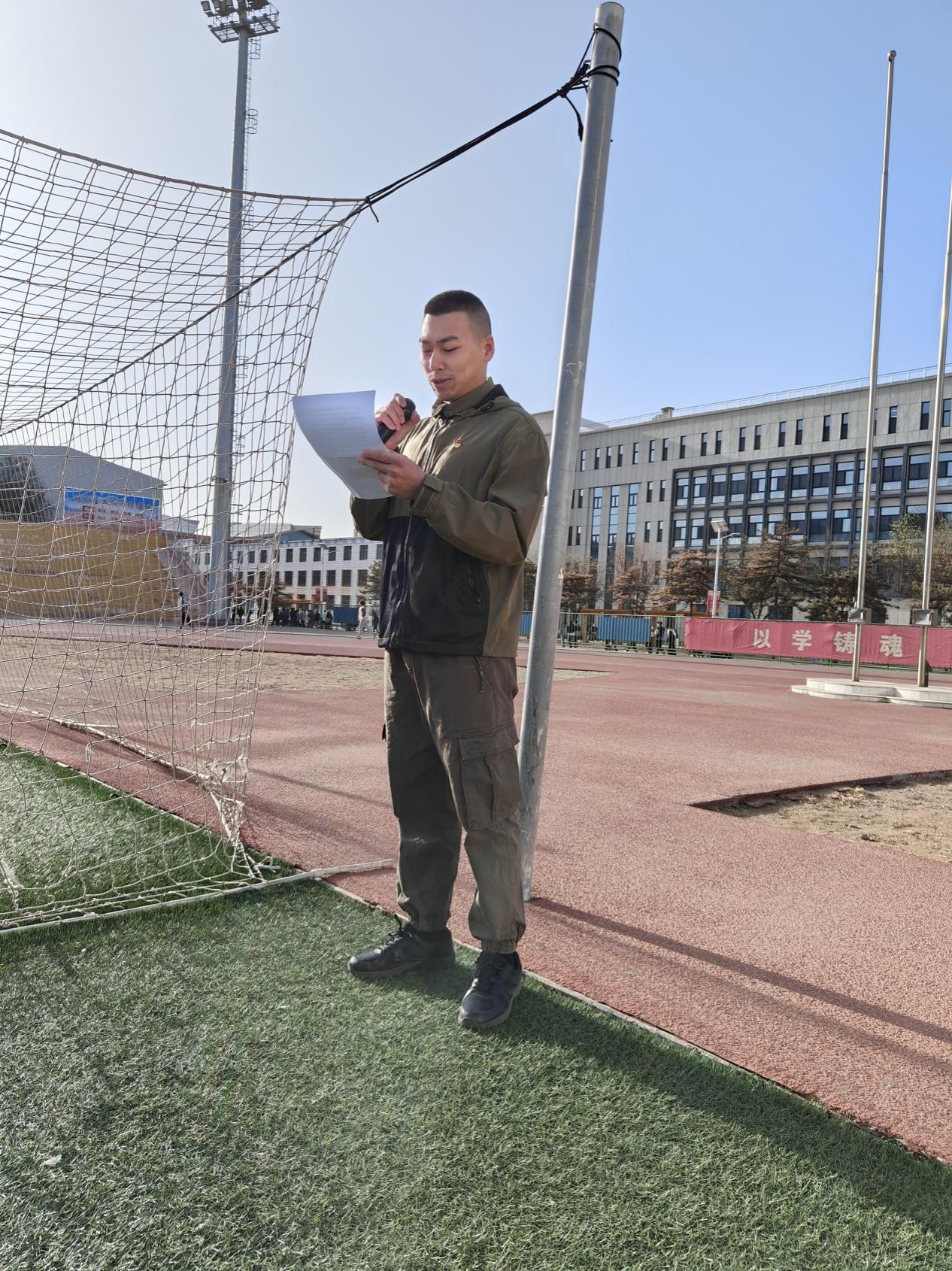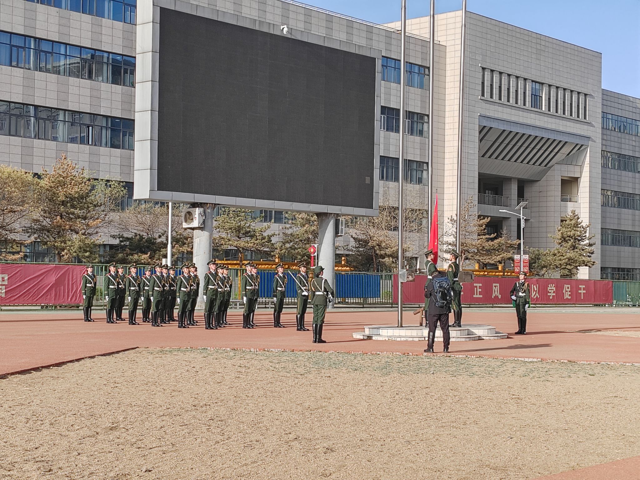 活动第二项,校国旗护卫队队员们迈着整齐而有力的步伐护卫着国旗入场。雄壮的国歌响起,全院师生庄严肃立,面向国旗行注目礼。