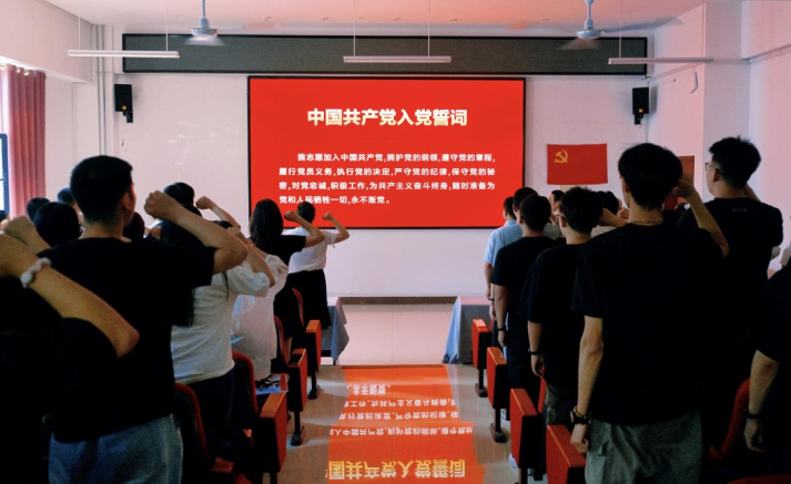 会议第三项,由学院领导及支部书记为毕业生党员佩戴党徽,由吴书记领誓,全体党员重温入党誓词。