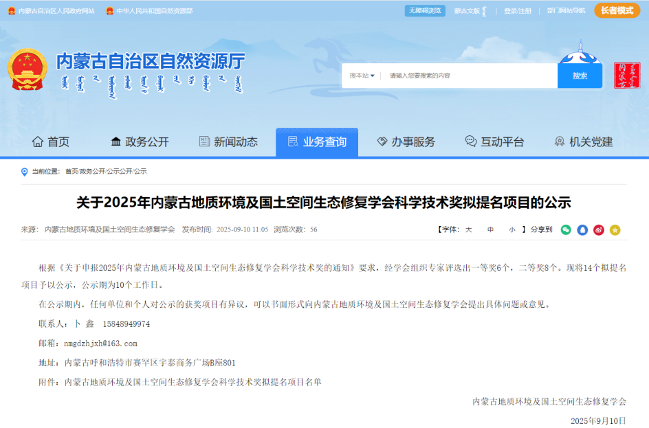 内蒙古自治区自然资源厅公布了2025年内蒙古地质环境及国土空间生态修复学会科学技术奖的评选结果。304永利集团魏光普副教授及生态与可持续设计团队完成的《“矿物基菌根菌剂+超富集植物+耐性蚯蚓”协同修复白云鄂博重金属污染的技术研究与示范》荣获内蒙古自治区自然资源厅生态修复学会“生态修复科学技术奖一等奖”。