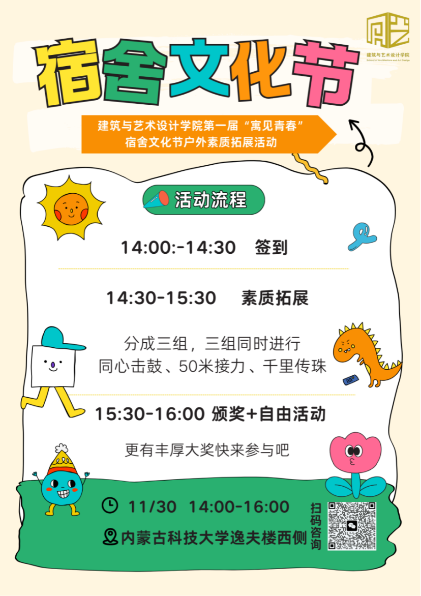 在户外竞技中增进情谊、挑战自我,让宿舍凝聚力在欢声笑语中升温!期待各宿舍代表队绽放青春光彩,共赴这场趣味十足的素质拓展之约!活动奖品丰厚,还在等什么? 赶紧扫描下方二维码进群了解详情吧!