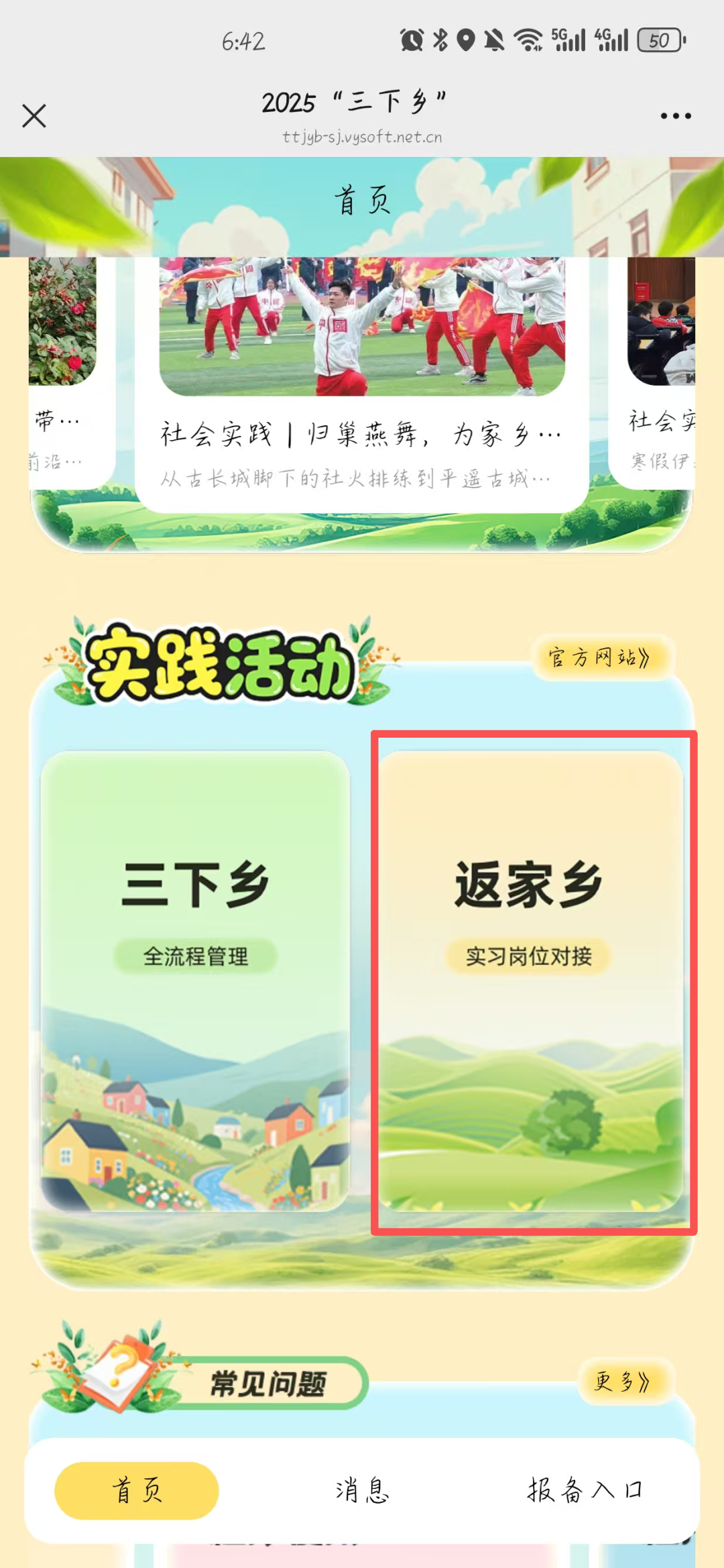有意向的大学生结合自身实际情况,关注“创青春”微信公众号,选择“社会实践”-“2025三下乡”-“返家乡”栏目,进入小程序,并根据系统提示进行注册、登录、报名,报名截止时间2026年1月5日。(具体流程如下)